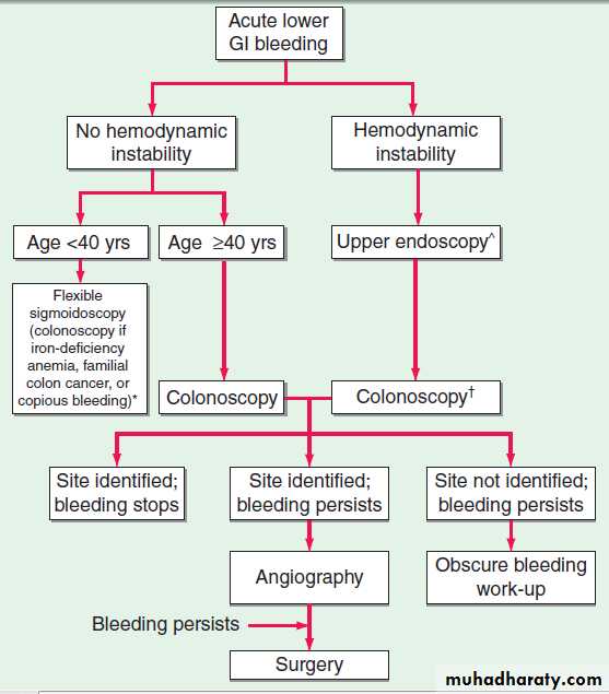 gastrointestinal (GI) bleeding. *Some suggest colonoscopy for anydegree of rectal bleeding in patients <40 years as well. ^ If upper GI endoscopy reveals definite source, no further evaluation is needed. †If