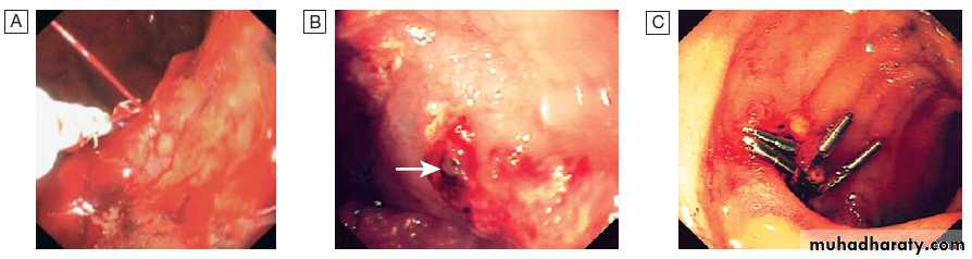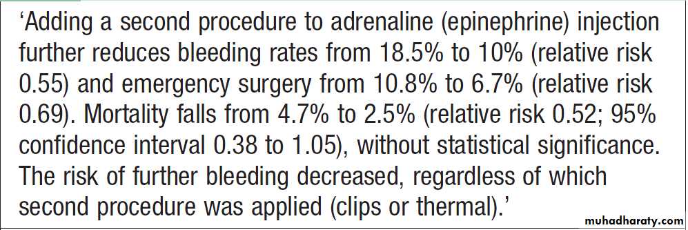 Management (continued)Patients who are found to have major endoscopic stigmata of recent haemorrhage can be treated endoscopically using a thermal or mechanical modality, such as a ‘heater probe’ or endoscopic clips, combined with injection of dilute adrenaline (epinephrine) into the bleeding point (‘dual therapy’).