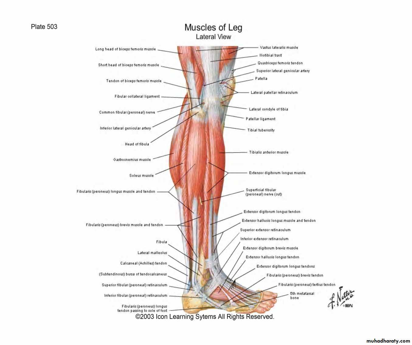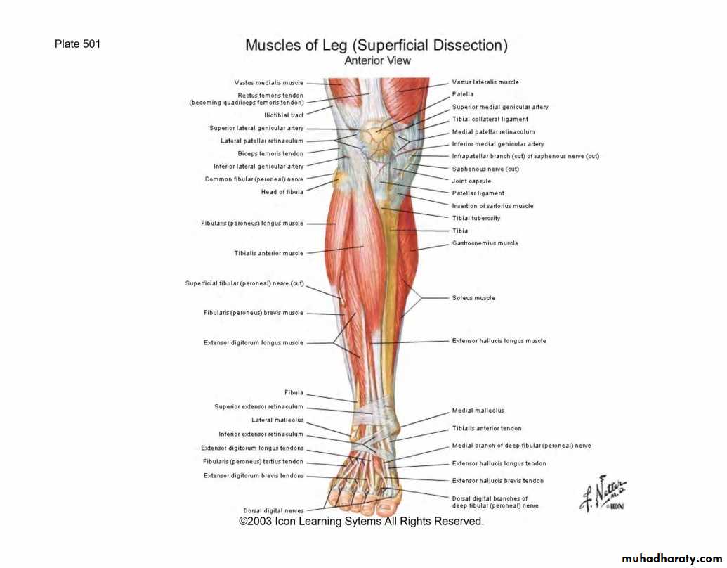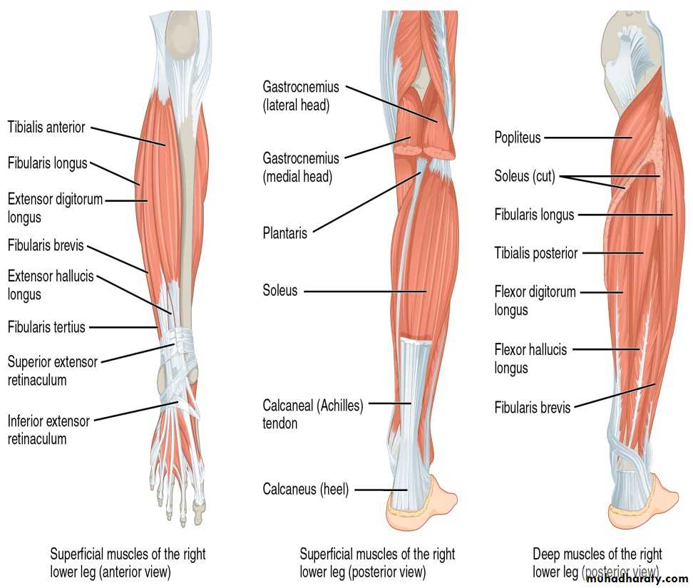 it attached to the patella, the patellar ligament and the tibial tuberosity..the crural fascia attached to the tibial condyles and the head of the fibula Inferiorly ,at the ankle joint , the deep fascia is thickened to form retinacula which act as a pulley to prevent displacement of the tendons of the muscles.
