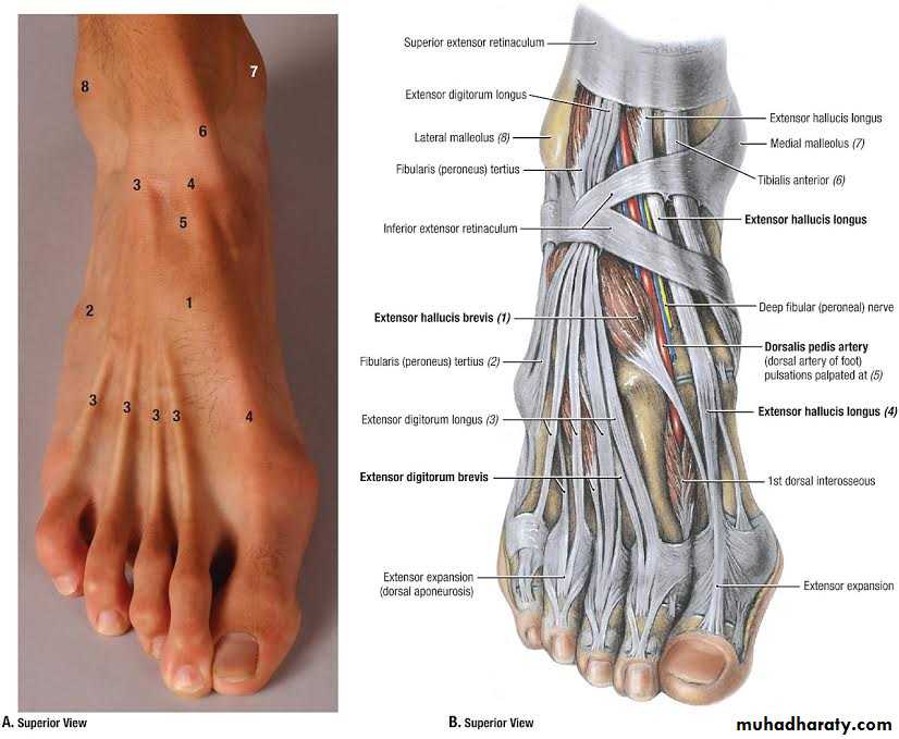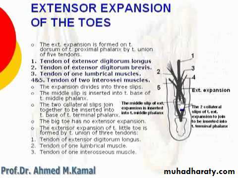 Extensor digitorum brevis muscle: originates at the calcaneus and divides into three muscle bellies whose tendons insert at the dorsal aponeurosis and the middle phalanges of the second to fourth toes.Extensor hallucis brevis muscle