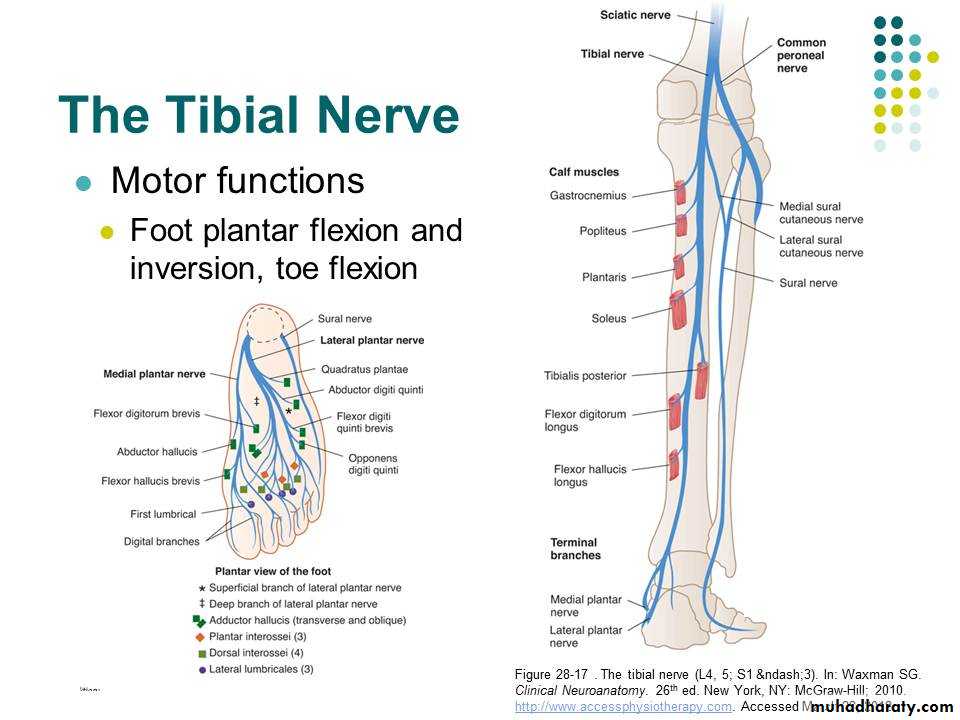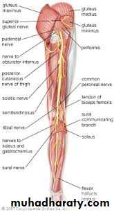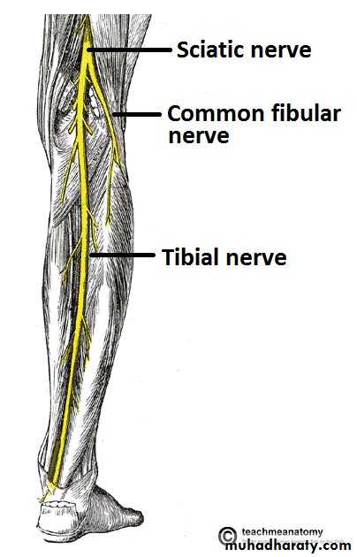 The princible nerve of the back of the leg is the Tibial nerve (L4,5,S1,S2,S3) passes under the tendinous arch of the solus muscle and descend under the transverse intermuscular septum superficial to the posterior tibial vessels. in the upper part of the leg it lies on the popliteus m. then posterior to the tibialis posterior m.