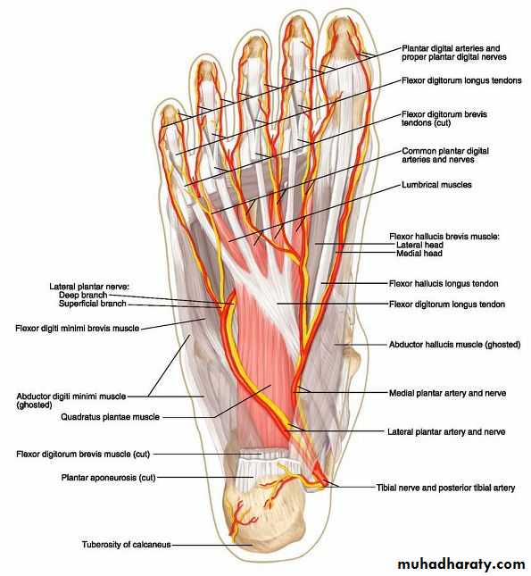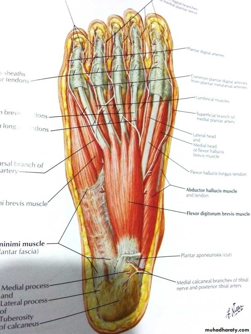 It lies deep to the planter aponeurosis, bounded on either side by the medial and lateral intermuscular fascia which passes from the margins of the aponeurosis to the planter interosseous fascia. It contains the flexor digitorum brevis muscle, the tendons of the flexor digitorum longus and its associated muscles ( quadratus plantae and four lumbrical muscles), the tendon of the flexor hallucisFrolich, Human Anatomy, Lower LImb