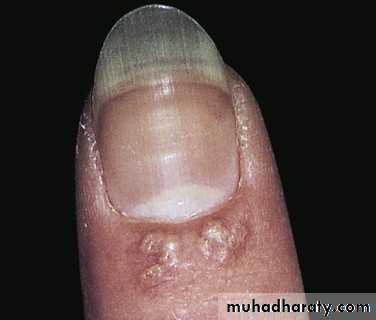 Warts on the lateral nailfold and on the fingertip may extend deeply under the nail.