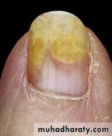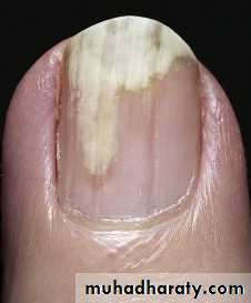 Begins at the distal groove and progresses irregularly and proximally, causing part or most of the plate to become separated.The nonadherent portion of the nail is opaque with a white, yellow or green tinge.