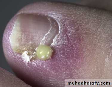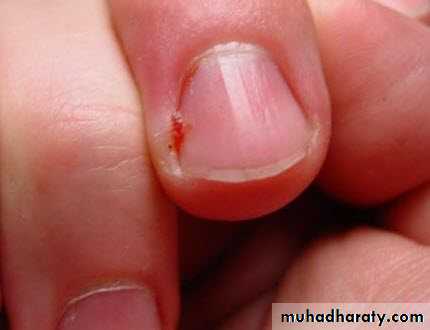 The rapid onset of painful, bright red swelling of the proximal and lateral nailfold may occur spontaneously or may follow trauma or manipulation.Infections present with an accumulation of purulent material behind the cuticle .