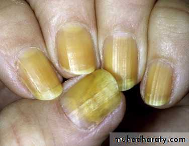 The nail plate may become excessively curved, and it turns dark yellow. The surface remains smooth or acquires transverse ridges. Onycholysis may occur. The cuticles and lunulae are lost, and usually all the nails are involved.