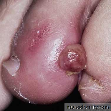 The area of penetration becomes purulent and edematous as exuberant granulation tissue grows alongside the penetrating nail.