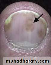 Trauma to the proximal nailfold causes hemorrhage that may not be apparent for days and then grows with the nail.