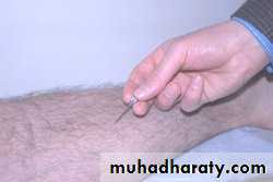 Using the pin, the patient is lightly pricked on the forehead or chest, to familiarize him with the sensation.As above, the patient closes his eyes and counts when he perceives the sensation.