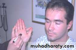 Ask the patient to close his eyes.Take the patient's index finger in one of your hands.