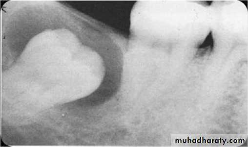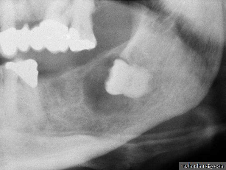 Cysts (abnormal, closed-walled sac present in or around tissue): usually X-ray detected and removed before they enlarge and destroy bone tissue. Some types are:A- Dentigerous: cystic sac containing a tooth or tooth bud particle.