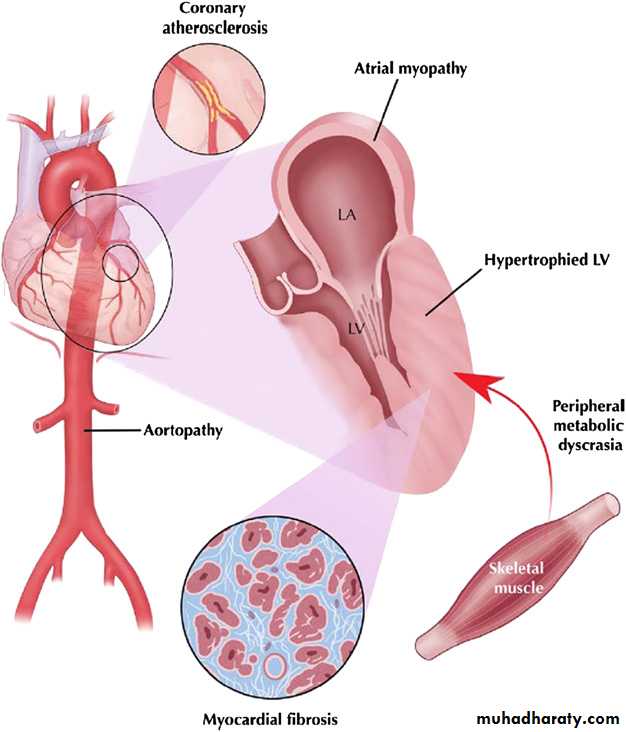 aortopathy to myocardial remodelling and even peripheral energy utilisation that interactto produce sequelae such as heart failure, arrhythmias, and ischaemic events. LA, left