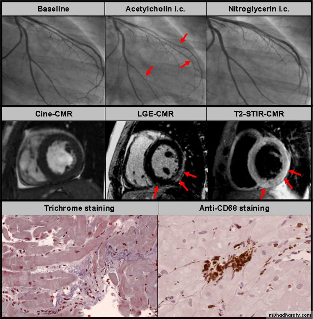 coronary vasospasm occurred (red arrows) in the left anterior descending artery (LAD) and the left circumflex artery (LCX) and the patient felt the same chest pain as he did at home. After intracoronary glyceryl trinitrate infusion the chest pain as well as the coronary vasospasm disappeared. Mid panel: Cine cardiac magnetic resonance (CMR) images revealed a normal systolic function. However, late gadolinium enhancement (LGE) and T2 weighted oedema CMR images were suggestive of acute myocarditis with myocardial damage in the subepicardium of the left ventricular free wall (red arrows). Lower panel: Endomyocardial biopsies were taken from the left ventricular free wall and trichrome staining revealed accumulation of inflammatory cells and essential structural abnormalities indicative of myocarditis. Immunohistochemical staining with anti-CD68 antibodies proved the accumulation of macrophages and confirmed the diagnosis of acute myocarditis (courtesy of Professor K Klingel and Professor R Kandolf from the University of Tu¨bingen).