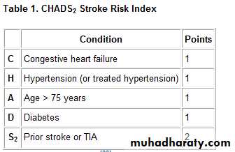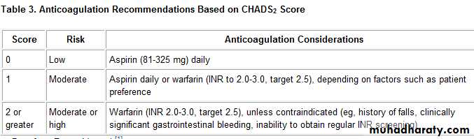 • Patients with moderate to high risk of stroke require warfarin long term for preventing emboli; aspirin is adequate in patients with low risk of stroke.