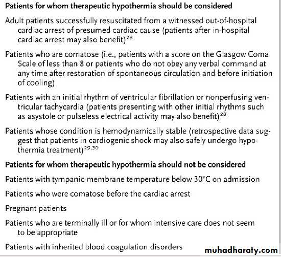 • Therapeutic hypothermia should be considered for adult patients successfully resuscitated from a witnessed out-of-hospital cardiac arrest of presumed cardiac cause, though patients after in-hospital cardiac arrest may also benefit. This measure should also be considered in patients who are comatose, and in patients with an initial rhythm of ventricular fibrillation or nonperfusing ventricular tachycardia (or other initial rhythms such as asystole or pulseless electrical activity).