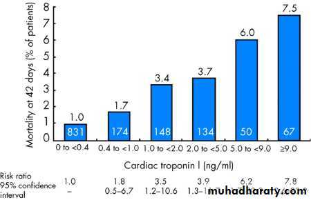 A raised troponin value is a powerful independent marker of adverse outcome in patients with unstable coronary syndromes. In the TIMI IIIB study the 42 day mortality rate was significantly higher in patients with troponin I concentrations of ≥0.4 ng/ml (3.7%) than in patients with troponin I concentrations <0.4 ng/ml (1.0%)