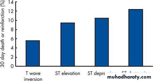 The ECG remains a simple and helpful test for risk stratification. A normal ECG without ST shift or T wave changes usually denotes good prognosis, while at the other end of the spectrum a high level of risk is suggested by dynamic ST segment changes. T wave changes carry intermediate significanceThe value of the 12 lead ECG in risk stratification: death or reinfarction rates in patients presenting with symptoms of cardiac ischaemia at rest and signs of myocardial ischaemia confirmed by ECG.
