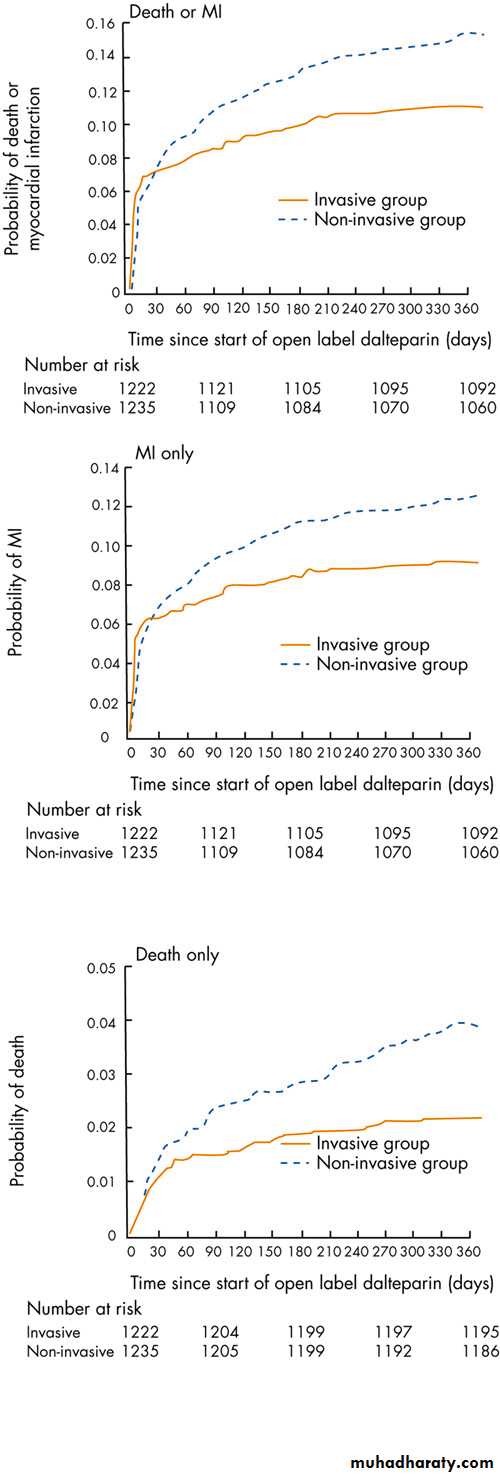 The FRISC II trial, in which an early invasive approach in acute coronary syndrome was compared to a non-invasive one in patients treated with low molecular weight heparin (dalteparin), clearly shows a significantly lower death rate in the group of patients randomised to an invasive approach. Similar reductions were also seen in the incidence of myocardial infarction and in the composite end points of death and myocardial infarction.The results of the FRISC II study showing the differences in death and MI (top), MI (middle), and death (bottom panel) between the groups of patients treated conservatively (dashed line) and invasively (solid line).