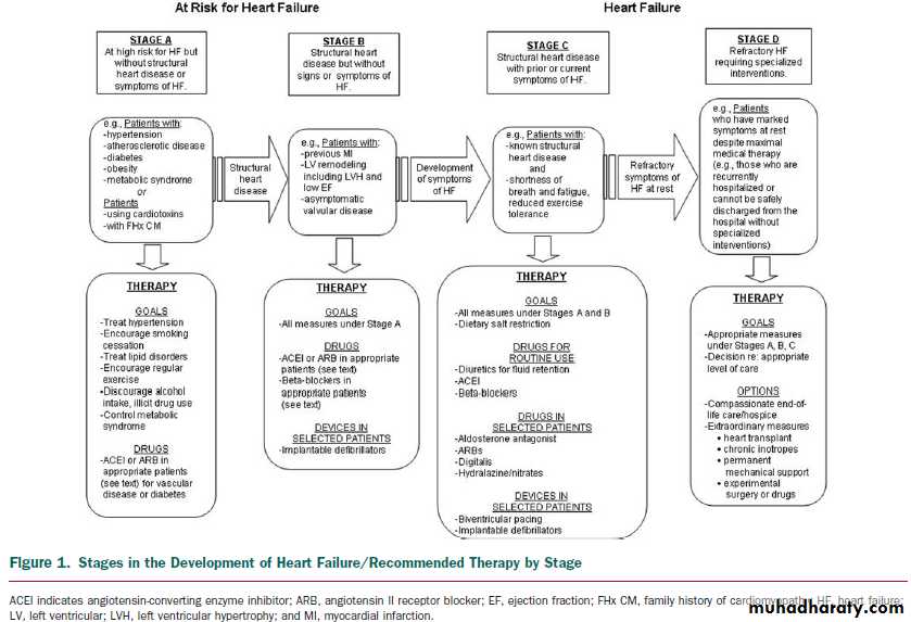 The HF writing committee previously developed a new approach to the classification of HF ,one that emphasized both the development and progression of the disease. In doing so, they identified 4 stages involved in the development of the HF syndrome. The first 2 stages (A and B) are clearly not HF but are an attempt to help healthcare providers with the early identification of patients who are at risk for developing HF.Stages A and B patients are best defined as those with risk factors that clearly predispose toward the development of HF.