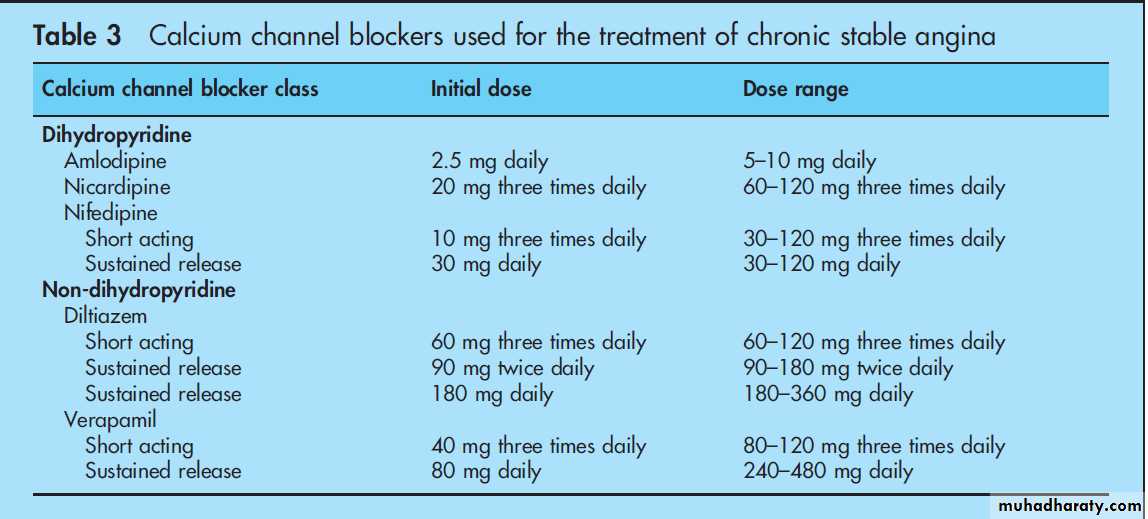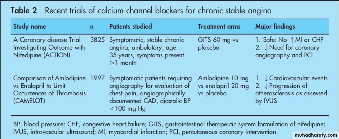 agents in patients with chronic stable angina. However, recent trials including ACTION (A Coronary disease Trial Investigating Outcome with Nifedipine) and CAMELOT (Comparison of Amlodipine versus Enalapril to Limit Occurrences of Thrombosis) have documented that calcium channel blockers are safe and beneficial in the treatment of CAD (table 2).
