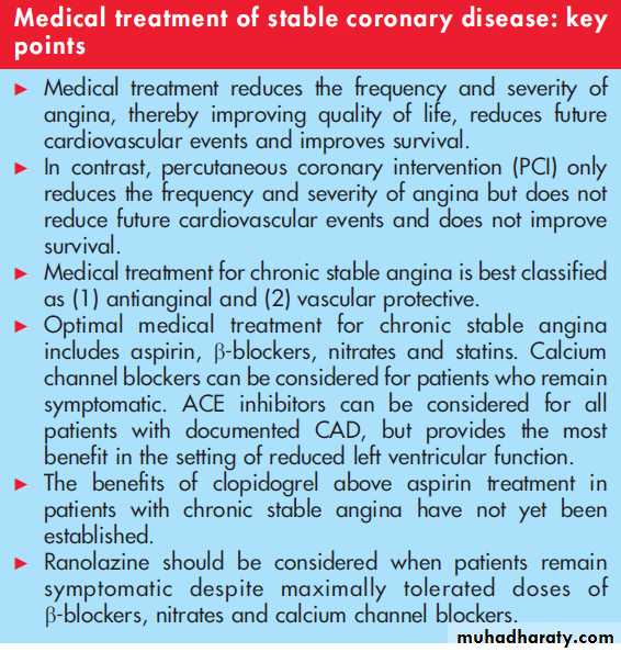 The long term medical management of patients with stable CAD includes the use of aspirin, b-blockers, nitrates and statins. Calcium channel blockers can be added if patients remain symptomatic, or used instead of b-blockers when quality of life issues (such as preserved exercise capacity) are the primary treatment goals. ACE inhibitors can be considered in patients with established CAD, but provide the most benefit in the setting of reduced left ventricular function. The novel agent ranolazine can be added to conventional treatment when patients remain symptomatic. PCI should be considered when angina limits quality of life.