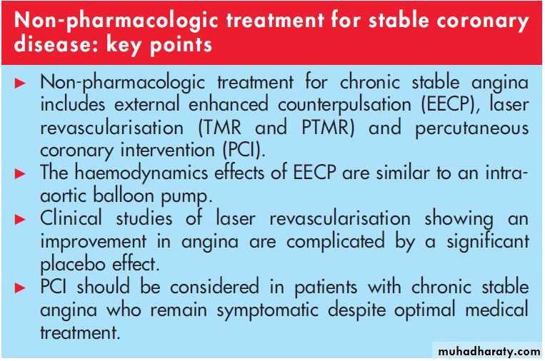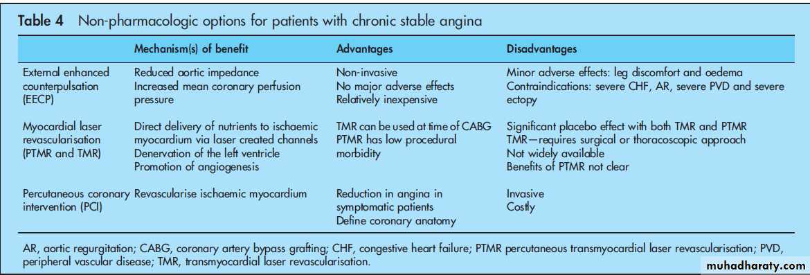 In addition to medical treatment, exercise, dietary modification and stress reduction should be applied in all patients.Additional therapeutic options in highly symptomatic patients on optimal medical treatment include external enhanced counter pulsation, transmyocardial laser revascularisation and PCI (table 4).