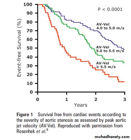 associated with a high risk of events in asymptomatic patients: rates of death or surgery were 56% at 1 year, 75% at 2 years, and 89% at 3 years.It should be noted that very severe AS was a marker of poor outcome only when using Vmax, whereas there was no significant difference in outcome according to whether the aortic valve area was ≤ or >0.6 cm2 (figure 1).