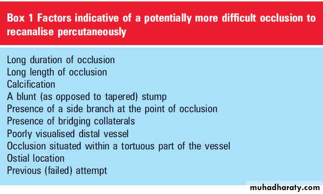The adjunctive use of intravascular ultrasound(IVUS) may facilitate recanalisation. Used in suitable