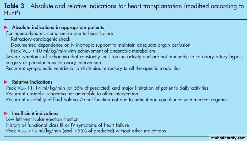 approach for the treatment of end stage heart failure and has been shown to improve exercise capacity, quality of life, and survival compared with conventional treatment.Selection criteria for heart transplantation are presented in table 3 while contraindications include current drug or alcohol abuse, lack of compliance, serious uncontrollable mental disease, severe comorbidity (that is, treated malignancy with remission and < 5 years follow-up, systemic infection, significant renal or hepatic failure), and fixed pulmonary hypertension.