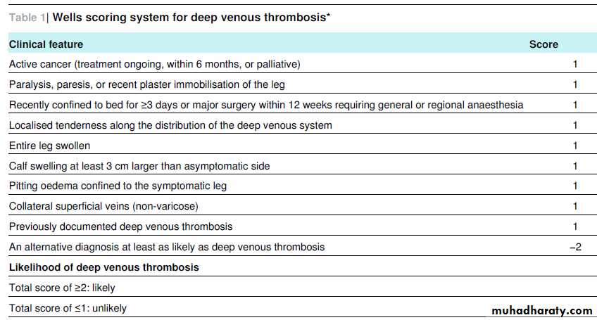 (“DVT likely”) on the Wells scoring system (table 1⇓),offer either (a) a proximal leg vein ultrasound scan to be done within four hours of being requested and, if the result is negative, a D dimer test; or (b) if a proximal leg vein ultrasound scan cannot be done within four hours, a Ddimer test and an interim 24 hour dose of a parenteral anticoagulant, with a proximal leg vein ultrasound scan to be done within 24 hours of being requested.