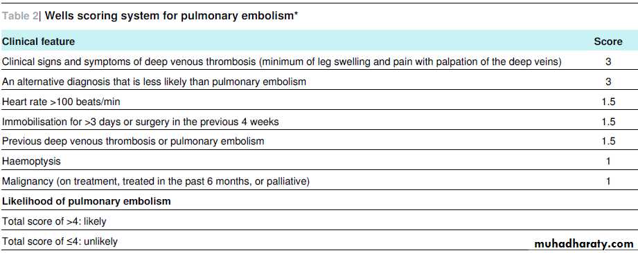 and who have a Wells score of >4 (“pulmonary embolism likely”) (table 2⇓), offer immediate computed tomography pulmonary angiography (CT pulmonary angiography) or, if such imaging cannot be done immediately, offer immediate interim parenteral anticoagulant treatment followed by CT pulmonary angiography. Consider aproximal leg vein ultrasound scan if the CT pulmonary angiography is negative and DVT is suspected.