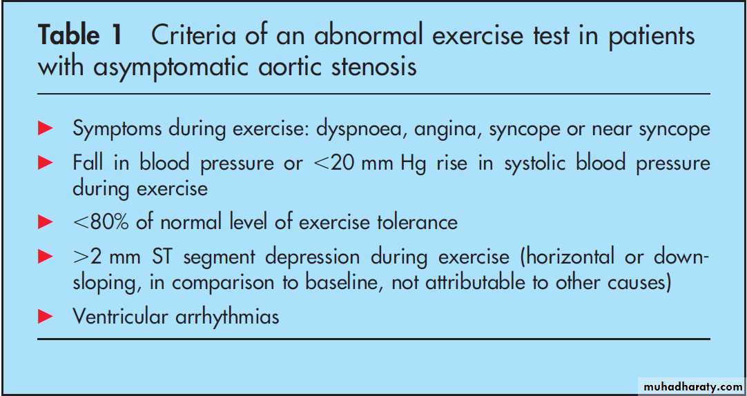 performed in asymptomatic patients under strict surveillance.Exercise testing in adults with aortic stenosis has poor diagnostic accuracy for evaluation of concurrent coronary artery disease.