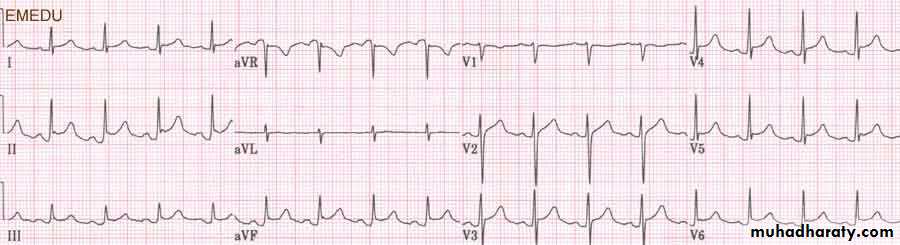 Acute pericarditis causes ST elevation - which is often described as saddle shaped or concave up - that is often widespread. This will not correspond to a particular coronary artery distribution. Such ST changes are seen in this ECG in almost all the leads. A pathognomonic finding of acute pericarditis is PR segment depression,6 as seen in leads II, III, and aVF above. This is not found in most patients however. Pericardial pain is typically pleuritic in nature, worse on lying flat, and relieved by sitting forward. An abnormal cardiac troponin has been reported in up to 50% of patients with idiopathic pericarditis.7 A rub may be heard, although this is often a transient finding and its absence in no way rules out the diagnosis.