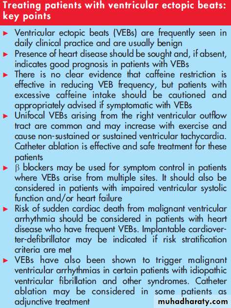 In the absence of heart disease and if VEBs are infrequent or reduce in frequency on ETT, with no documented VT, patients should be reassured and no specific treatment is required—especially if they are relatively asymptomatic. The same patients with significant symptoms should have their blood pressure checked and investigated and treated if high.