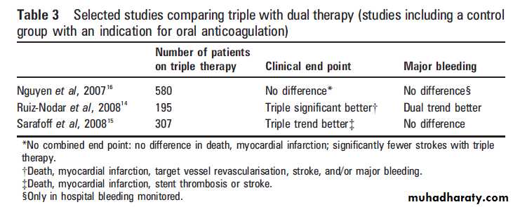 At least for longer follow-up periods (>30 days), the efficacy of triple therapy to prevent thromboembolic events appears to be significantly higher compared to DAT, and the efficacy of triple therapy to prevent subacute stent thrombosis seems to be higher compared to warfarin without DAT.