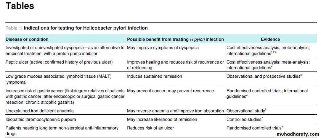 predictive value, but its positive predictive value depends on the pretest probability of H pylori infection, which in turn depends on the patient’s age, the prevalence of infection in his or her country of origin, and his or her socioeconomic status.Office based blood tests12 or antibody detection in urine or saliva are even less accurate and should not have a role in patient management.