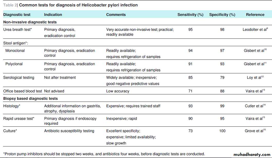 negative results, as shown in systematic reviews and several studies. Proton pump inhibitors should therefore be stopped two weeks before, and antibiotics four weeks before, testing for H pylori infection.