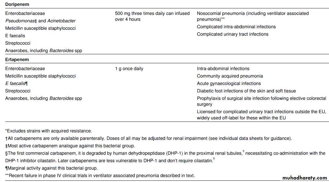 Doripenem—This recently launched analogue has similar activity to meropenem. It is twice as active in vitro against P aeruginosa, but whether this translates into clinical efficacy is debatable. Phase III clinical trials found doripenem was slightly less likely than imipenem to select for resistance in P aeruginosa pneumonia, but a recent phase IV trial comparing doripenem with imipenem-cilastatin in ventilator associated