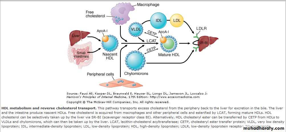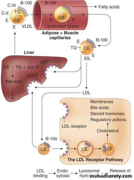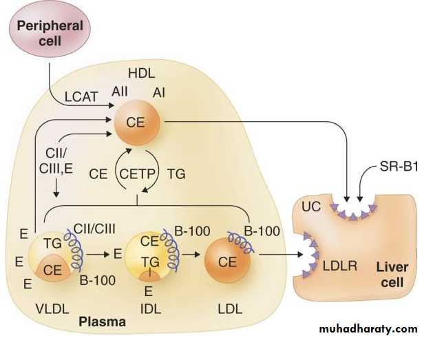 In the fasting state, the liver is the major source of plasma lipids .The liver may acquire lipids by uptake, synthesis or conversion from other macronutrients. These lipids are transported to other tissues by secretion of TG-rich very low-density lipoproteins (VLDL), which differ from chylomicrons in that they contain full-length Apo B100. Hydrolysis of VLDL TG releases fatty acids to tissues and converts VLDL into 'remnant' particles, (IDL). Most IDL are rapidly cleared by LDL receptors in the liver, but some are processed by hepatic lipase, which converts the particle to an LDL.Pathways of lipid transport are shown; in addition cholesterol ester transfer protein exchanges triglyceride and cholesterol ester between VLDL/chylomicrons and HDL/LDL, and free fatty acids released from peripheral lipolysis can be taken up in the liver.