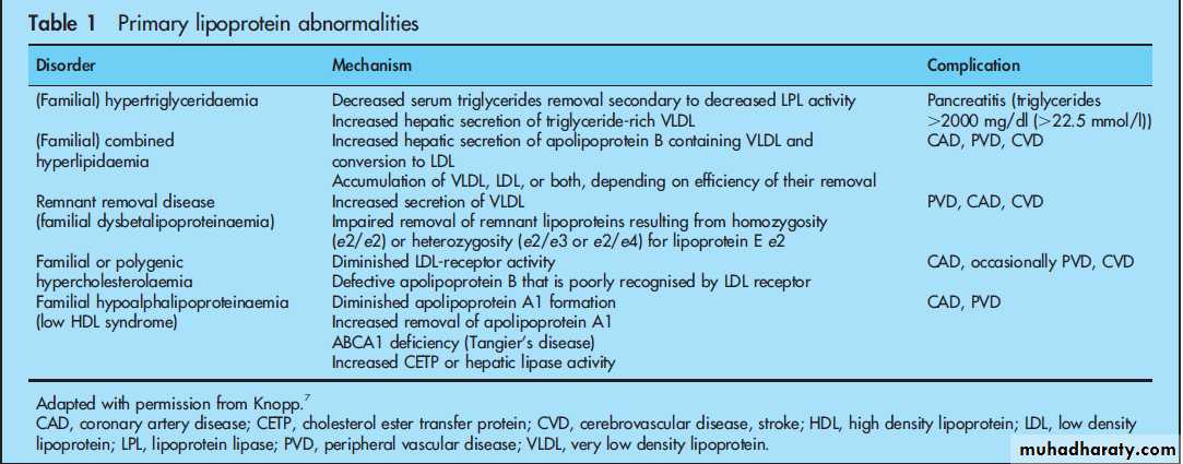 Lower values may also warrant treatment, especially in those with combined hyperlipidaemia (associated with modest elevations of LDL that are small and dense and low HDL). This atherogenic profile results in increased risk of premature CHD.