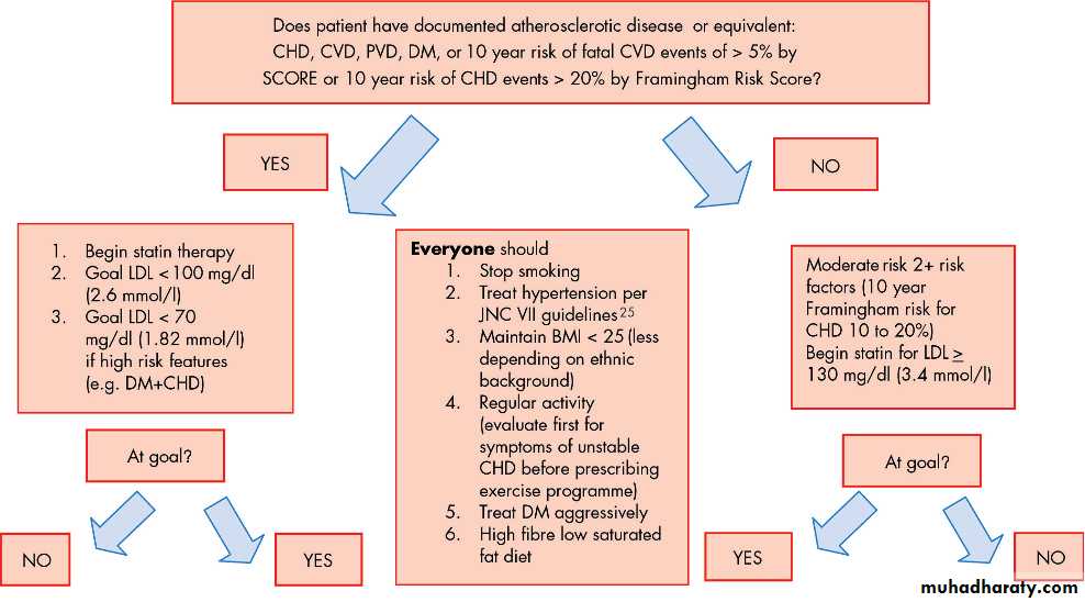 disease such as those with multiple risk factors resulting in a 10 year risk CVD mortality of>5% by the SCORE model, major elevation in one risk factor such as LDL>6 mmol/l (240 mg/dl), and those with diabetes mellitus which is considered a CHD equivalent.