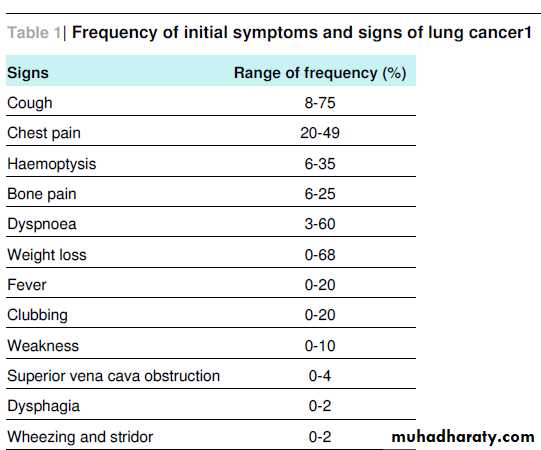 Lung cancer is the second most commonly diagnosed cancer in the United Kingdom. Because of the cancer’s insidious presentation, symptoms are not usually evident until the disease is advanced. At presentation 90% of patients are symptomatic.The most common presenting symptom is cough (8-75%), then weight loss, dyspnoea, chest pain, and haemoptysis (6-35%) (see table 1⇓).
