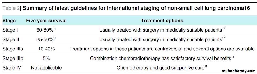 The latest version of the international staging classification for non-small cell lung carcinoma (version 7; 2009) can be used for the most current guidelines for treatment options and survivalrates (table 2⇓).