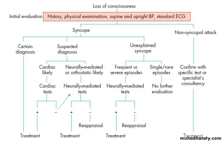 Syncope of the European Society of Cardiology1 2. Differentiating true syncope from other ‘‘non-syncopal’’ conditions associated with real or apparent transient loss of consciousness is generally the first diagnostic step and influences the subsequent diagnostic strategy. For the classification of syncope refer to table 1 and for the classification of non-syncopal attack refer to table 2. The conditions in which the results of the initial evaluation are diagnostic of the cause of syncope and no further evaluation is required are listed as recommendations in the section ‘‘The diagnostic strategy based on the initial evaluation’’. The features which suggest a cardiac or a neurally-mediated cause of syncope are listed in tables 3 and 4. Among cardiac investigations, echocardiography, prolonged electrocardiographic monitoring, stress test, electrophysiological study and implantable loop recorder are most useful. Among neurally-mediated investigations, tilt test, carotid sinus massage and implantable loop recorder are most useful. When a cardiac diagnosis cannot be confirmed, neurally-mediated tests are usually performed. Once the evaluation, as outlined, is completed and no cause of syncope is determined, reappraisal of the work-up may be needed. BP, blood pressure; ECG, electrocardiogram.