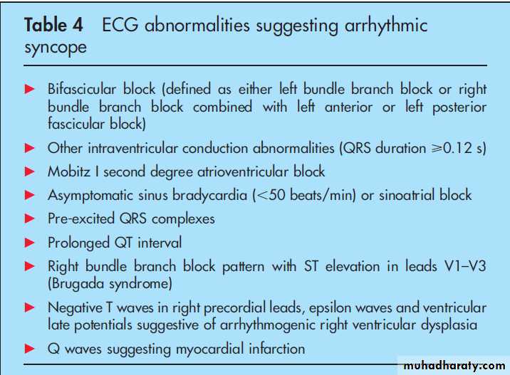 Whilst an ECG may be normal in most patients with syncope it MUST be performed in every syncopal patient who presents to the Emergency Department. (Evidence Level 1b)The current European Society of Cardiology syncope guidelines17 document the ECG abnormalities that increase the risk of a syncope secondary to arrhythmia as: