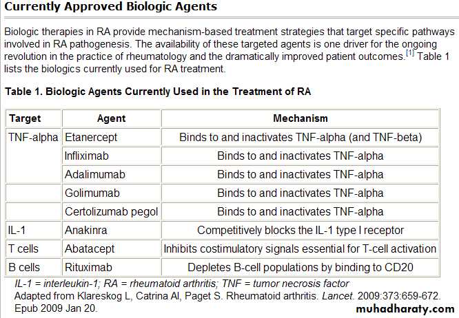 • 4. fourth group are the biologics, TNG-neutralizing agents (infliximab, etanercept, and adalimumab), IL-1-neutralizing agents (anakinra), those that deplete B cells (rituximab), and those that interfere with T cell activation (abatacept).