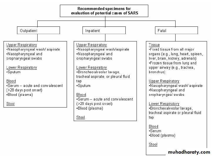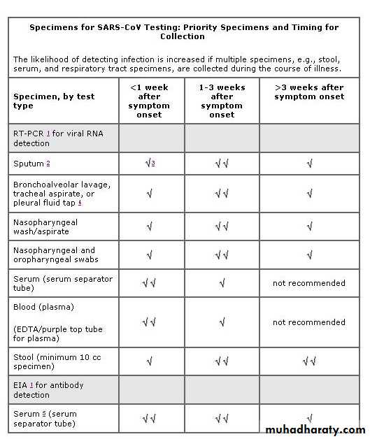Limited data suggest that serum may be the best specimen for SARS-CoV PCR diagnostics during the first few days of illness.
