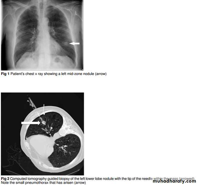Computed tomography revealed a 17 mm peripheral nodule staged as T1aN0M0. The patient was counselled regarding treatment options and was initially keen to know a diagnosisand consider surgery. The nodule was biopsied percutaneously under computed tomographic guidance, complicated by a small pneumothorax that did not require intervention (fig 2⇓).
