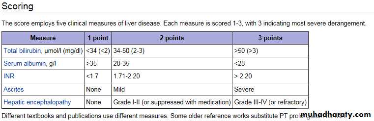 Mildly raised values do not exclude severe chronic liver disease; indeed evidence exists that substantial liver damage may be present even with relatively mild biochemical derangements.1 Therefore we recommend that even mild derangements of aminotransferase values that persist on retesting over a three month period should be investigated further.If clinical features suggest a more pressing need for investigation (such as jaundice or raised bilirubin, deranged clotting, or hepatic decompensation) investigation should be expedited.The Child-Pugh score (sometimes the Child-Turcotte-Pugh score) is used to assess the prognosis of chronic liver disease, mainly cirrhosis. Although it was originally used to predict mortality during surgery, it is now used to determine the prognosis, as well as the required strength of treatment and the necessity of liver transplantation.