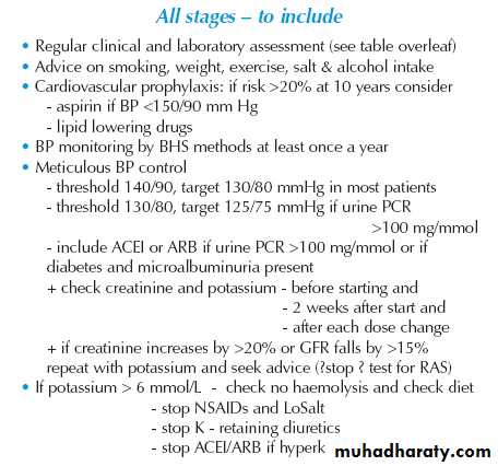 The renoprotective benefits of ACE inhibitors or ARBs are not seen in patients with chronic kidney disease who do not have diabetes or proteinuria. Since cardiovascular disease is the most common cause of complications and death among patients with chronic kidney disease, particularly when they also have diabetes, ACE inhibitors or ARBs should be considered for the treatment of hypertension in these patients. The propensity for hyperkalemia increases with declining glomerular filtration rate, and therefore these agents should be used with caution in patients with advanced chronic kidney disease, with or without proteinuria.